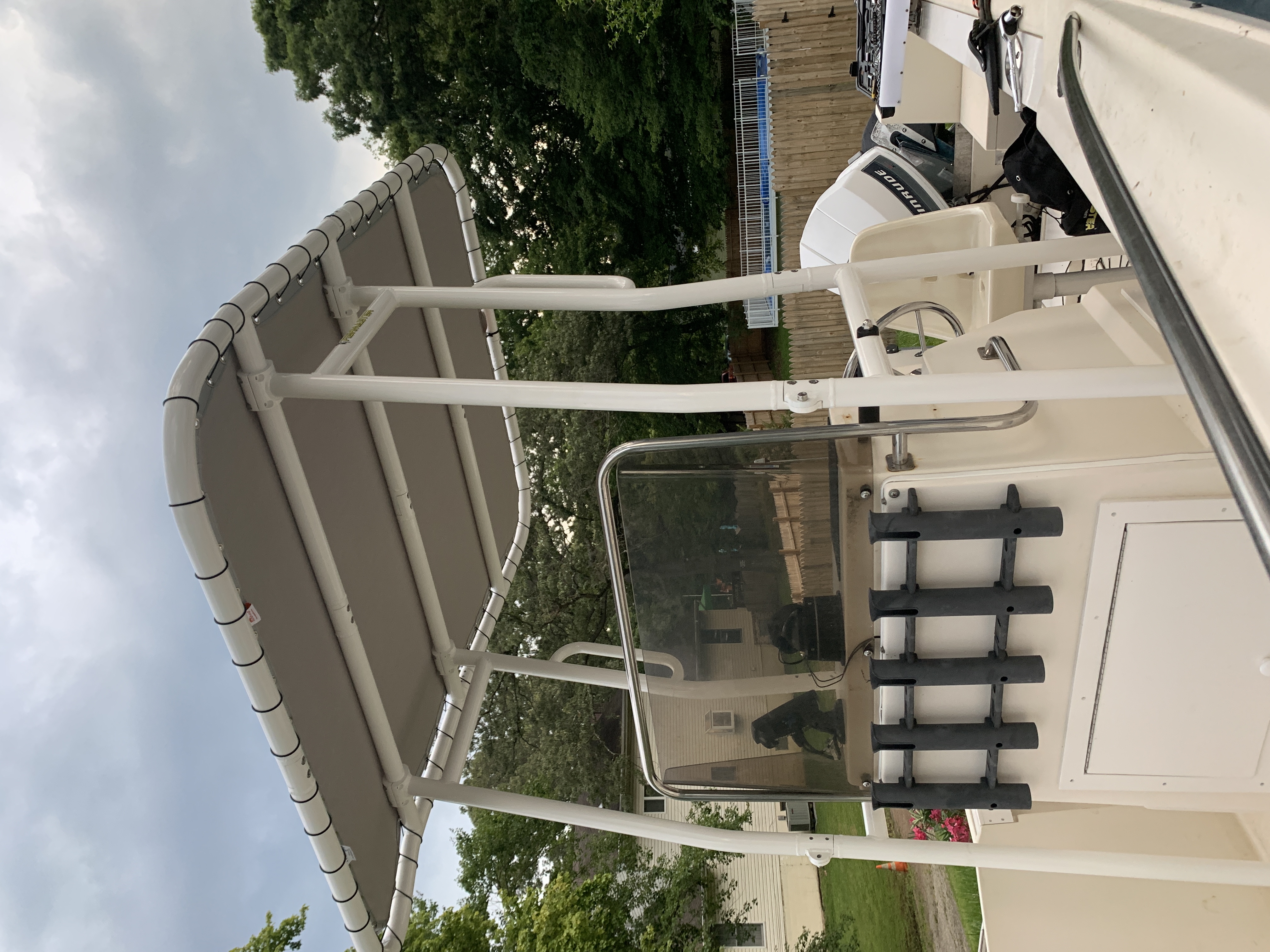 The tubing is 1-1/2" schedule 40 pipe with a 1.900" outside diameter. The tube material is 6061-T6 marine grade aluminum that is polished and bright dip anodized which is the industry standard for T-Tops, wakeboard towers, radar arches, tuna towers, etc. All the hardware is 316 grade stainless steel, also a workhorse of the marine industry. The fabric is Sunbrella Marine grade Acrylic.