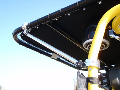 To fold the canopy section of the top, you would remove the bolts located at the hinged section of the top. This would allow the canopy to fold. For easier folding, please see our Quick Release Knobs.